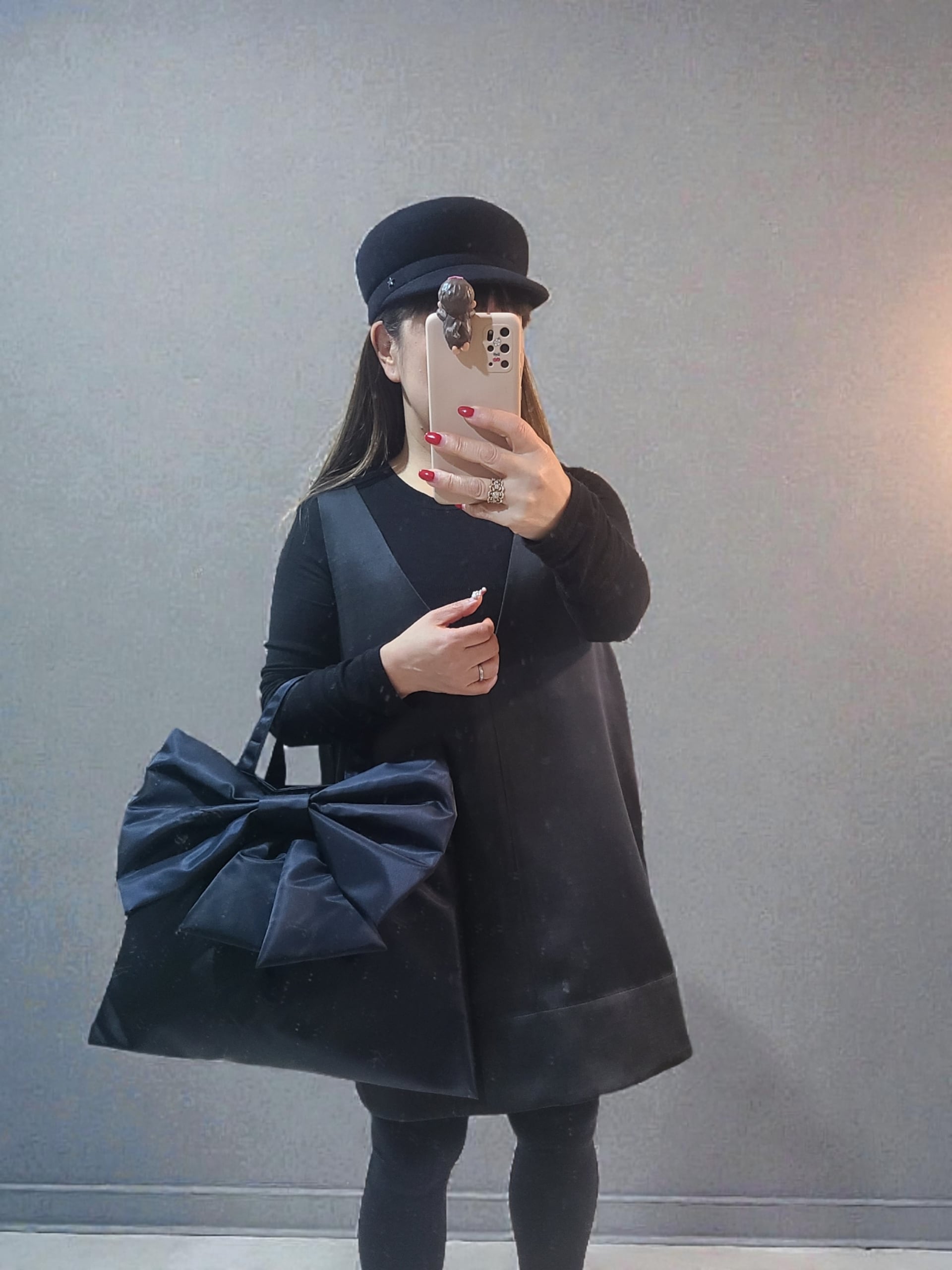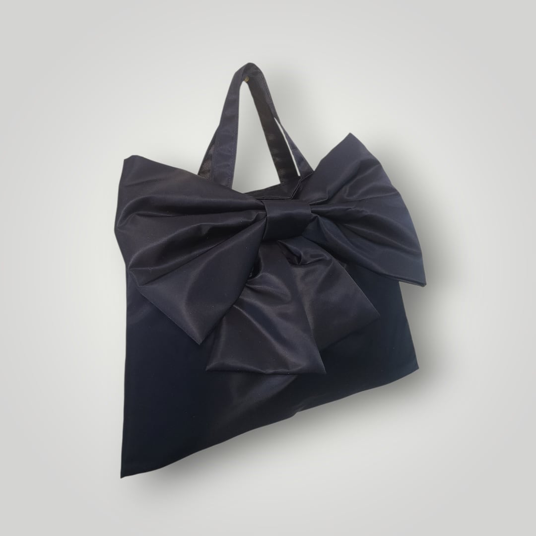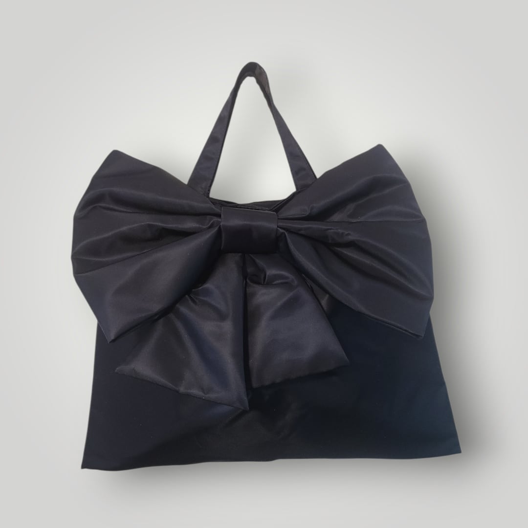 生地は軽量ながらも厚手裏地とふかふか芯を挟んでる事でしっかり感を保ち、持ち運びも楽々です。内側には便利なポケットも完備しており、小物の収納も安心です。立体的なリボンの存在感がポイントで、シンプルなお洋服に合わせても明るさを添えるアイテムとなっています。